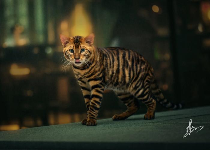 虎头虎脑,琥珀色身体,黑色条斑。她养猫的爱好和经验继承于母亲,她母亲培育成功了豹纹猫Bengal。她母亲培育豹纹猫的动机是:当时的女人纷纷为豹纹大衣疯狂,希望家里沙发上有个豹纹的可爱偎人的小东西可以消除女人对豹皮的渴望。