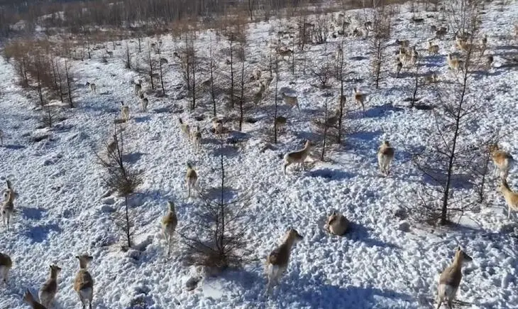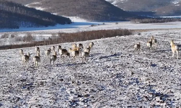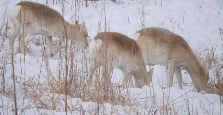 而且咱们内蒙有关部门会在这些蒙原羚来过冬的地方投放些盐砖、玉米等饲料,然后组建临时小队巡护,有情况就马上去处理。这在客观上也增加了蒙原羚的体验感。不看着不行,这些蒙原羚因为被照顾太好警惕性很低,甚至会直窜进老百姓的院子里。