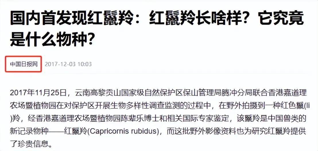中国日报网《国内首发现红鬣羚:红鬣羚长啥样?它究竟是什么物种?》,2017-12-3