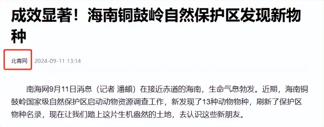 北青网《成效显著!海南铜鼓岭自然保护区发现新物种》,2024-9-11
