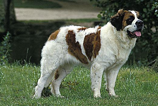 圣伯纳犬,别名:圣伯纳德犬,起源于瑞士,其历史比较久远,但在19世纪中期,该犬的数量一直减少,濒临灭绝。