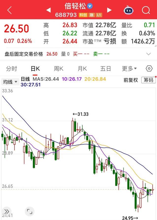 先说倍轻松这家做按摩仪的公司。很多人可能家里就有他们的眼部按摩器或者颈椎按摩器,用着挺舒服,广告也打得响亮。这家公司2021年夏天上市,那时候股价最高冲到131元,多少人觉得这是个好赛道,智能小家电嘛,谁家颈椎不喊疼呢?结果四年多过去,股价现在只剩26元左右,在25元附近晃了三年,像个被遗忘的老朋友,偶尔反弹一下就又蔫了。