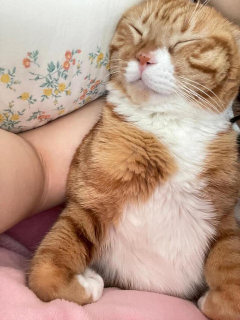 3、由胸部向腹部梳理:将猫咪抱起,呈人的姿势坐到腿上,从上往下梳理。猫咪的肚子比较敏感,铲屎官在进行梳毛时,一定要快速又准确。