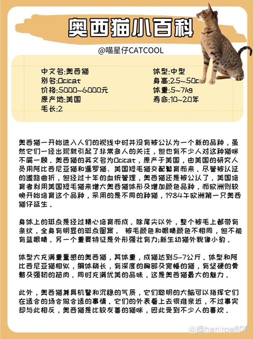 奥西猫性格友善,具有警惕性,外形拥有充满野生气息的斑点纹,且除脖子附近及尾巴以外,分布全身,它体型较大,成年猫体重达到5-7公斤,拥有宽广的胸部和结实的肌肉,兼具了野生猫的精悍和饲养猫的沉稳的气质,这是奥西猫极为特殊的魅力。