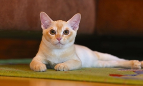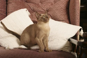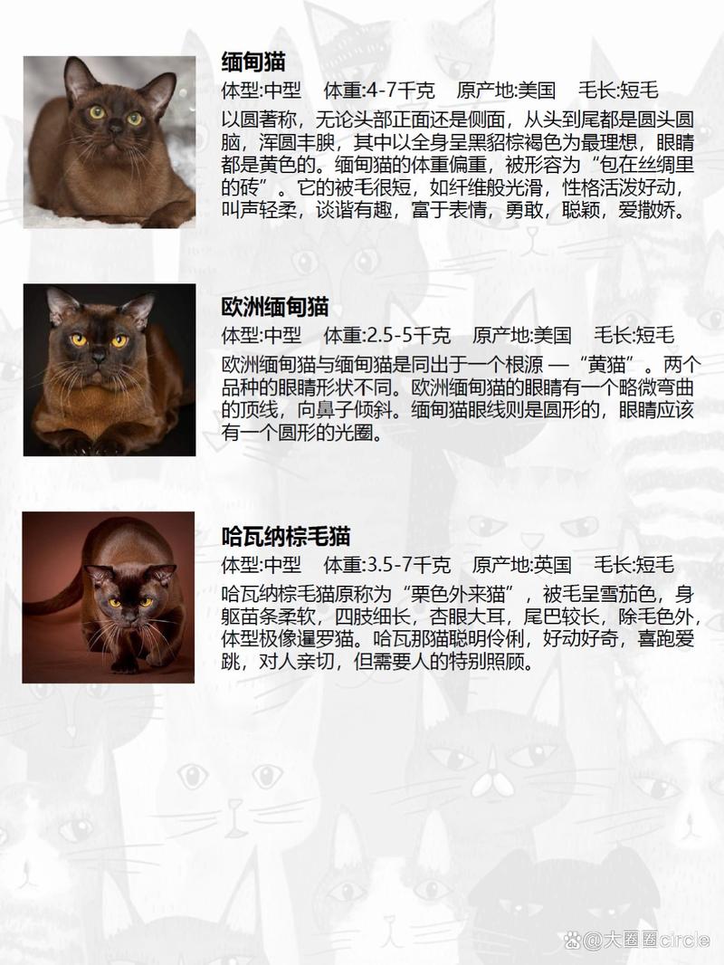 缅甸猫共有10个品种,其中以全身呈黑貂棕褐色为最理想,各种缅甸猫的眼睛都是黄色的。大部分分布在缅甸仰光。缅甸猫的体重显得偏重,经常被形容为“包在丝绸里的砖”。此猫以圆著称,无论头部正面还是侧面,从头到尾都是圆头圆脑,被毛很短,如纤维般光滑,不需要每日的梳理。缅甸猫性格温和,活泼好动,诙谐幽默,叫声轻柔,爱撒娇,不惧怕陌生人,喜欢和人呆在一起,像个小孩子,和谁都能亲近,是很好的观赏伴侣动物,很适合饲养在有小孩的家庭。