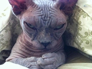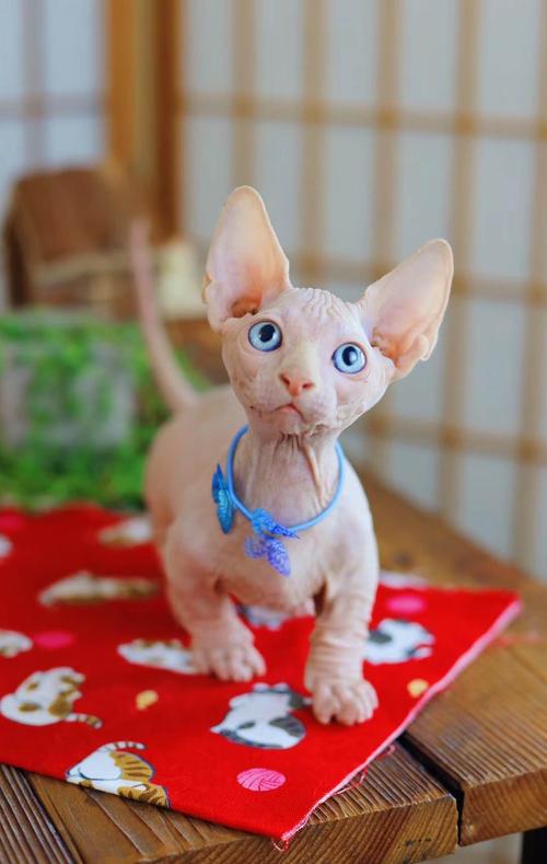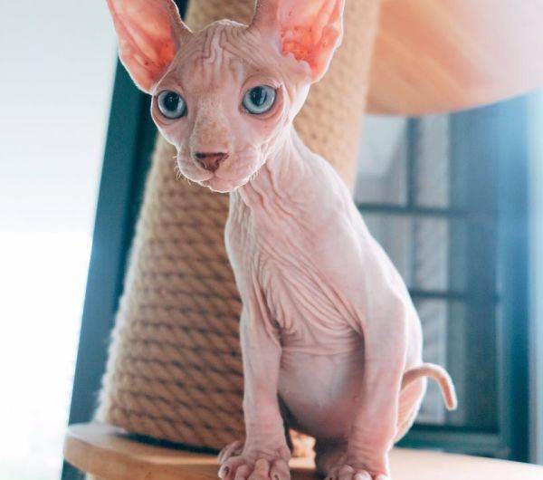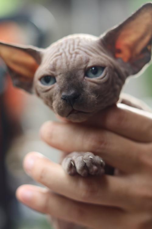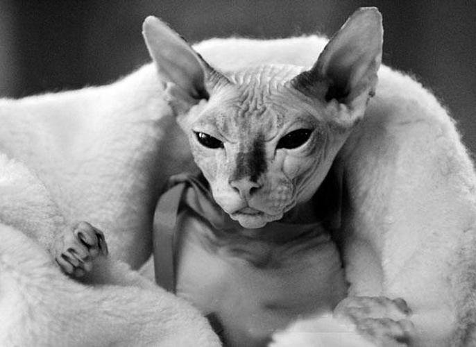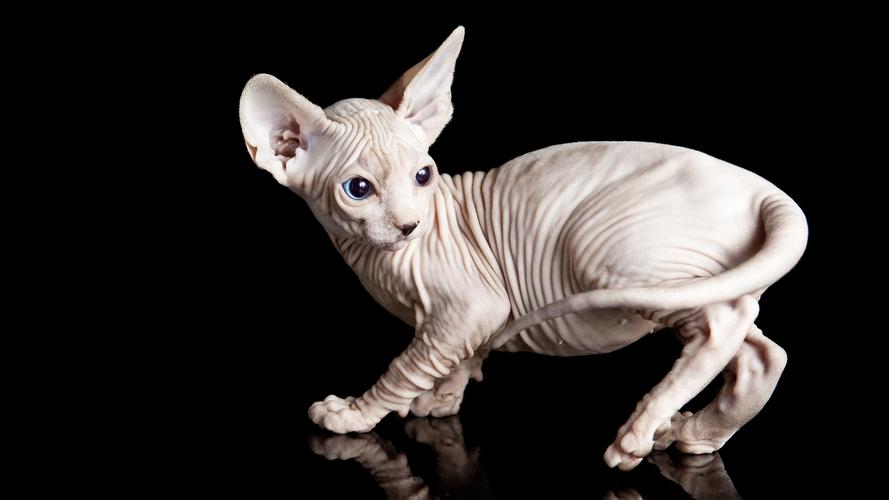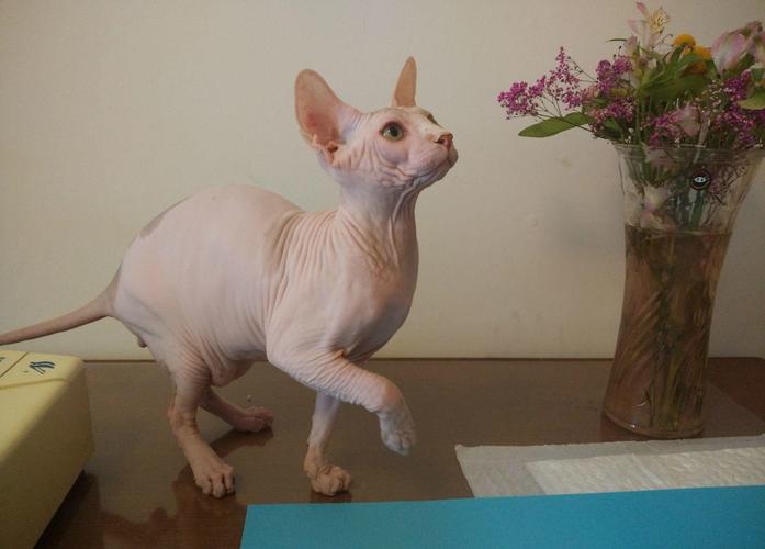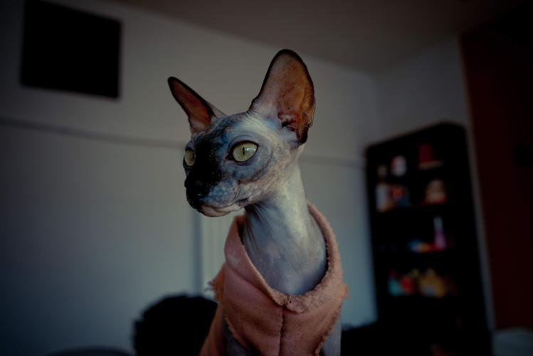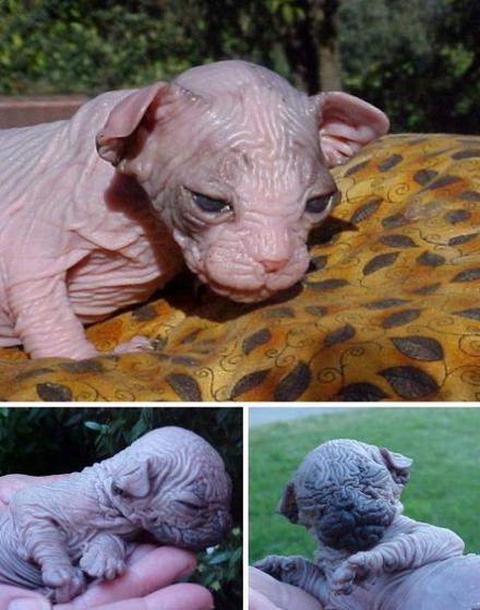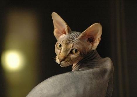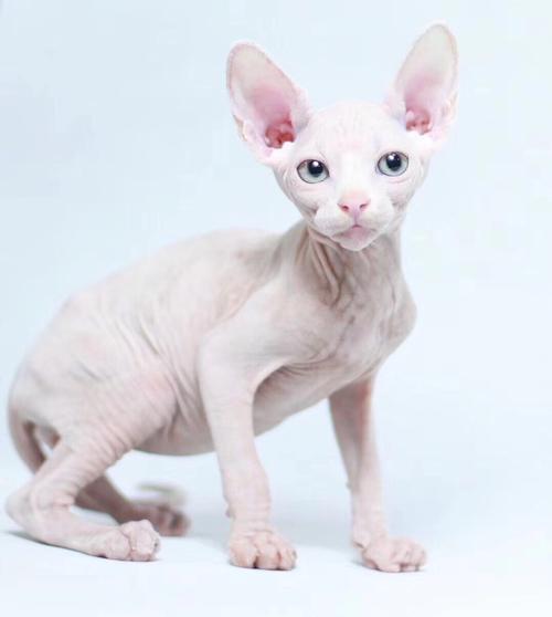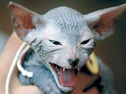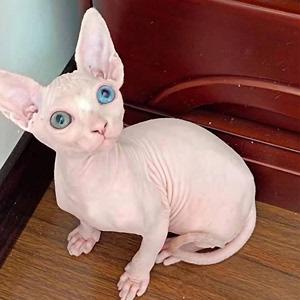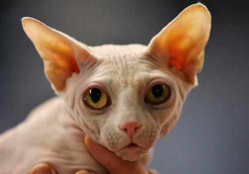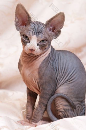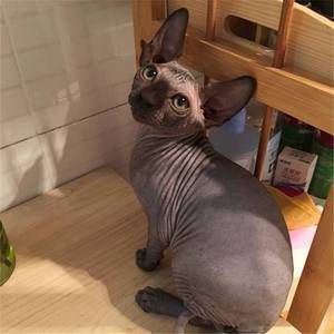 加拿大无毛猫,英文名:Canadian Hairless,别名:斯芬克斯猫,在1966年,加拿大安大略省多伦多市养猫爱好者从无毛的猫仔中,经过不断近选育培养出了一种没有毛的猫品种,专门为对猫毛过敏的爱猫者培育。它们无毛的性状是由自然的基因突变产生,除了在耳、口、鼻、尾前段、脚等部位有些胎毛外,全身几乎无毛,皮肤有褶皱但富有弹性。