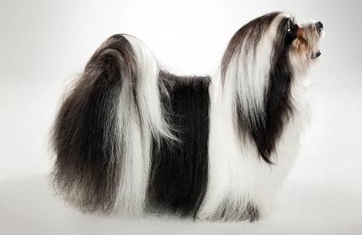 它头盖宽平,眼大椭圆,体毛丰厚。毛发柔软而厚密,常为金色、银色、白色、蓝色等单一底色附带若干色斑,其中纯白色种最为珍奇。尾巴多毛且弯曲翘向后背, 步态富有弹性。它曾是南美贵族们百逗不厌的活玩具以及高贵地位的象征, 如今成了美洲犬迷的心肝宝贝, 也是美国犬迷的最爱之一。